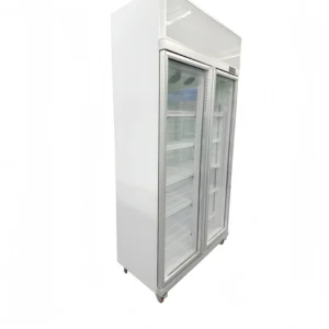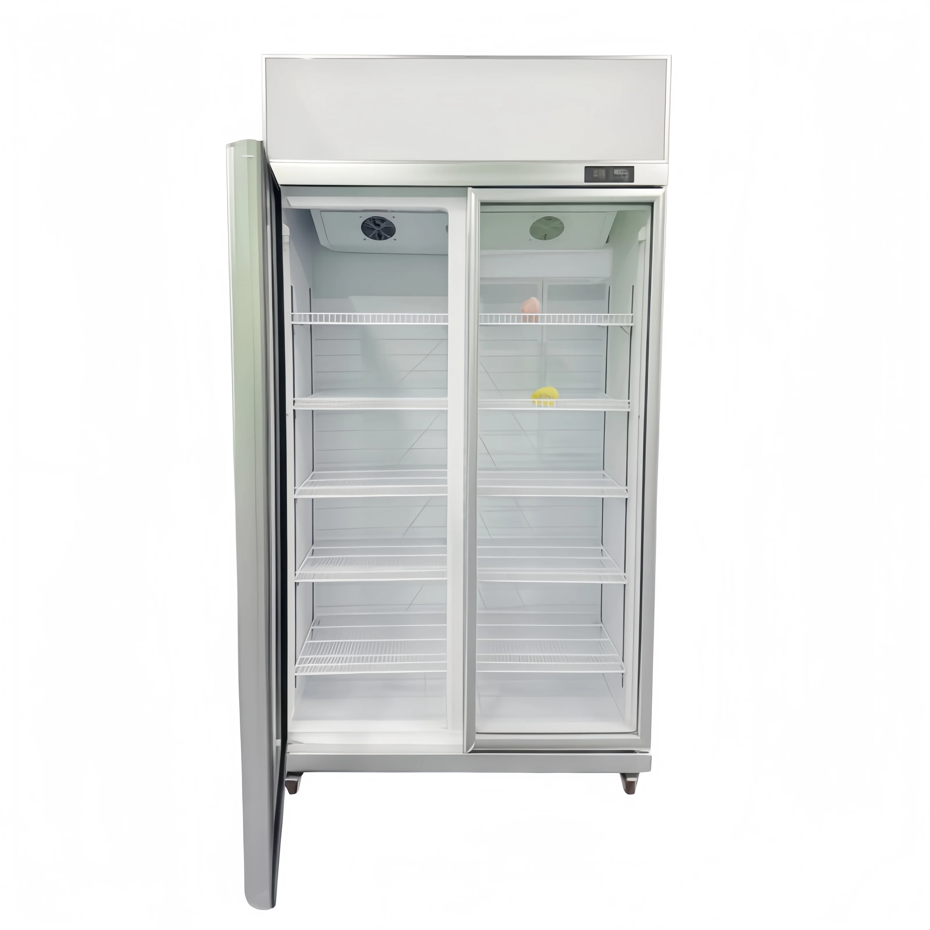 Double-door Upright showcase chiller with aluminum alloy frame.